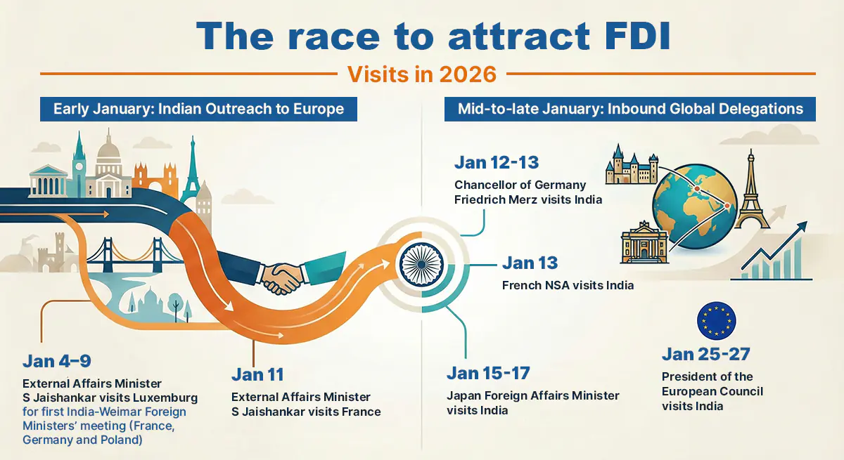 पिछले दो महीनों से, भारतीय नेताओं का उन देशों में जाने का एक साफ ट्रेंड दिख रहा है जो FDI और हाई टेक्नोलॉजी के सोर्स हैं या ऐसे देशों के नेताओं का दिल्ली को अपनी पसंदीदा जगह बनाना।