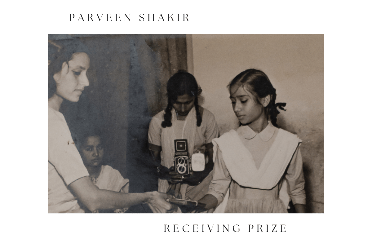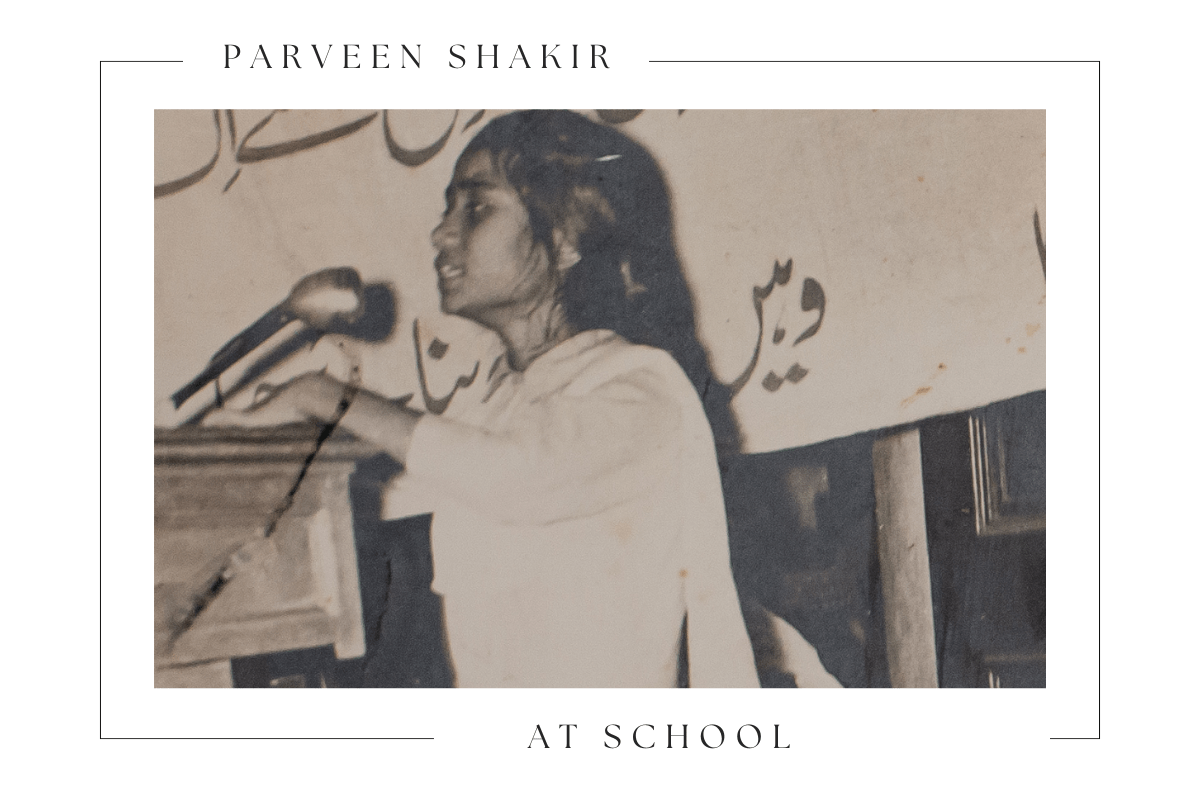 यह तस्वीर परवीन शाकिर की है जब वह स्कूल में तक़रीर कर रही थीं। परवीन शुरू से ही बहुत तेज़-तर्रार और होनहार तालिबा (student) थीं। वह हमेशा अपनी क्लास में पहले नंबर पर आतीं और स्कूल के लिए इनाम और इज़्ज़त कमातीं।