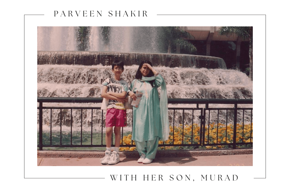 1992 में डिज़्नीलैंड में अपने बेटे के साथ ली गई इस तस्वीर में परवीन शाकिर नज़र आ रही हैं। उन्हें अपने बेटे मुराद की परवरिश करना बेहद पसंद था। जैसे-जैसे मुराद बड़ा होता गया, परवीन शाकिर उसे प्यार से “गीतु” कहकर बुलाने लगीं।