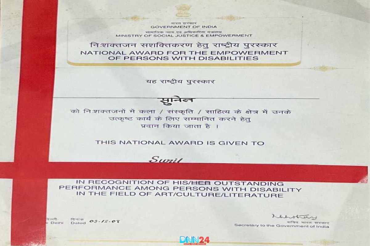 जब टीचर ने उनकी पेंटिंग देखी तो वो हैरान थी। संस्था के डायरेक्टर डॉक्टर जसपाल सिंह भाटिया ने सुनील को स्टेट और नेशनल लेवल तक लेकर गये। भारत की पूर्व राष्ट्रपति प्रतिभा देवीसिंह पाटिल द्वारा सुनील को सम्मानित किया गया। सुनील इसके अलावा भी कई सारे अवॉर्ड पा चुके हैं। 2006 में हैंडीकैप वेलफेयर फेडरेशन से सर्टिफिकेट, 2007 में भारत विकास परिषद कालका परवाणू पेंटिंग में गोल्ड मेडल जीता। 2019 में विजुअल आर्ट एग्जिबिशन में सर्टिफिकेट, 2009 में 18वां मैंगो मेला हरियाणा टूरिज्म में सर्टिफिकेट, उन्हें 2019-2020 में सामाजिक न्याय और अधिकारिता विभाग हरियाणा की पेटिंग में पहला स्थान मिला।